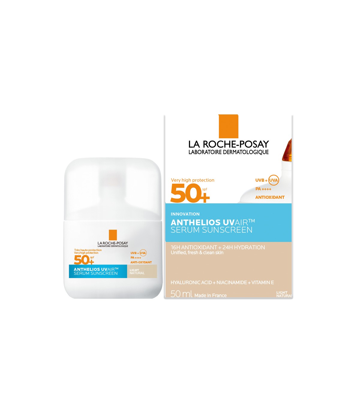 Anthelios UVAIR SPF50+ tono claro de La Roche Posay, un protector solar con color, tan ligero como el aire con una cobertura natural ligera que se funde perfectamente con la piel. Con ácido hialurónico, niacinamida y vitamina E, una combinación de activos dermatológicos que hidratan la piel, protegen contra el estrés oxidativo gracias a sus propiedades antioxidantes y equilibran el sebo. Para todo tipo de pieles, hipoalergénico, testado dermatológica y oftalmológicamente. Formulado para limitar el picor ocular.