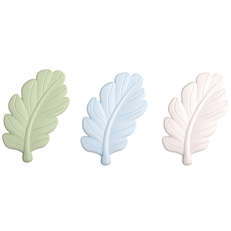 Mordedor de silicona suave y ergonómico, diseñado para bebés desde 0 meses, que alivia las molestias de la dentición y estimula el desarrollo sensorial y la motricidad fina, con un diseño en forma de hoja inspirado en la naturaleza.